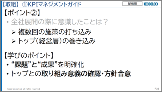 KOBELCOは、KPIマネジメントの浸透を「社内の文化」を変えることと捉え、「知る」「分かる」「使う」の3つの段階的なレベルアップを意識して活動を展開しました。特に「知る」「分かる」の段階においては、全社展開を確実にするための緻密な工夫が見られました。
