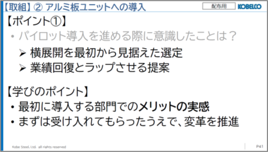 これに対し、横展開を最初から見据え、かつ業績回復とラップさせる(目標達成のプロセスを可視化することで業績回復を後押しする)というメリットを提示し、素材系のアルミ板ユニットがパイロット導入対象として選定されました。