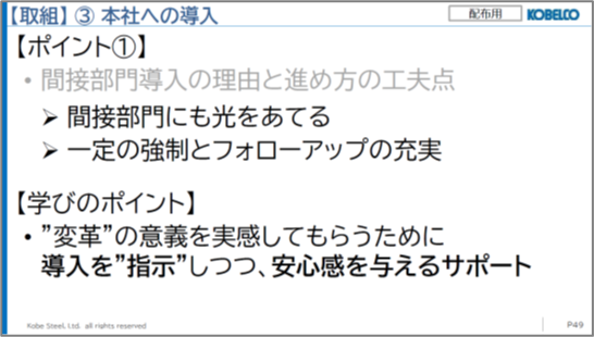 これは「間接部門にも光をあてる」という目的のもと、一定の強制と十分なフォローアップをセットで実施することで推進されました。