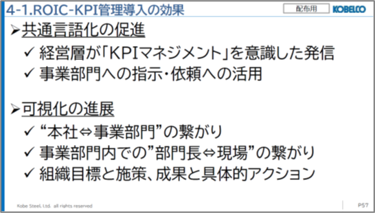 KOBELCOにおけるROIC経営導入の背景から、その柱の一つとしての「ROIC-KPI管理」の組織内への浸透・定着について、難所へどのようにアプローチしているか、実体験に基づく貴重な知見を共有していただきました。